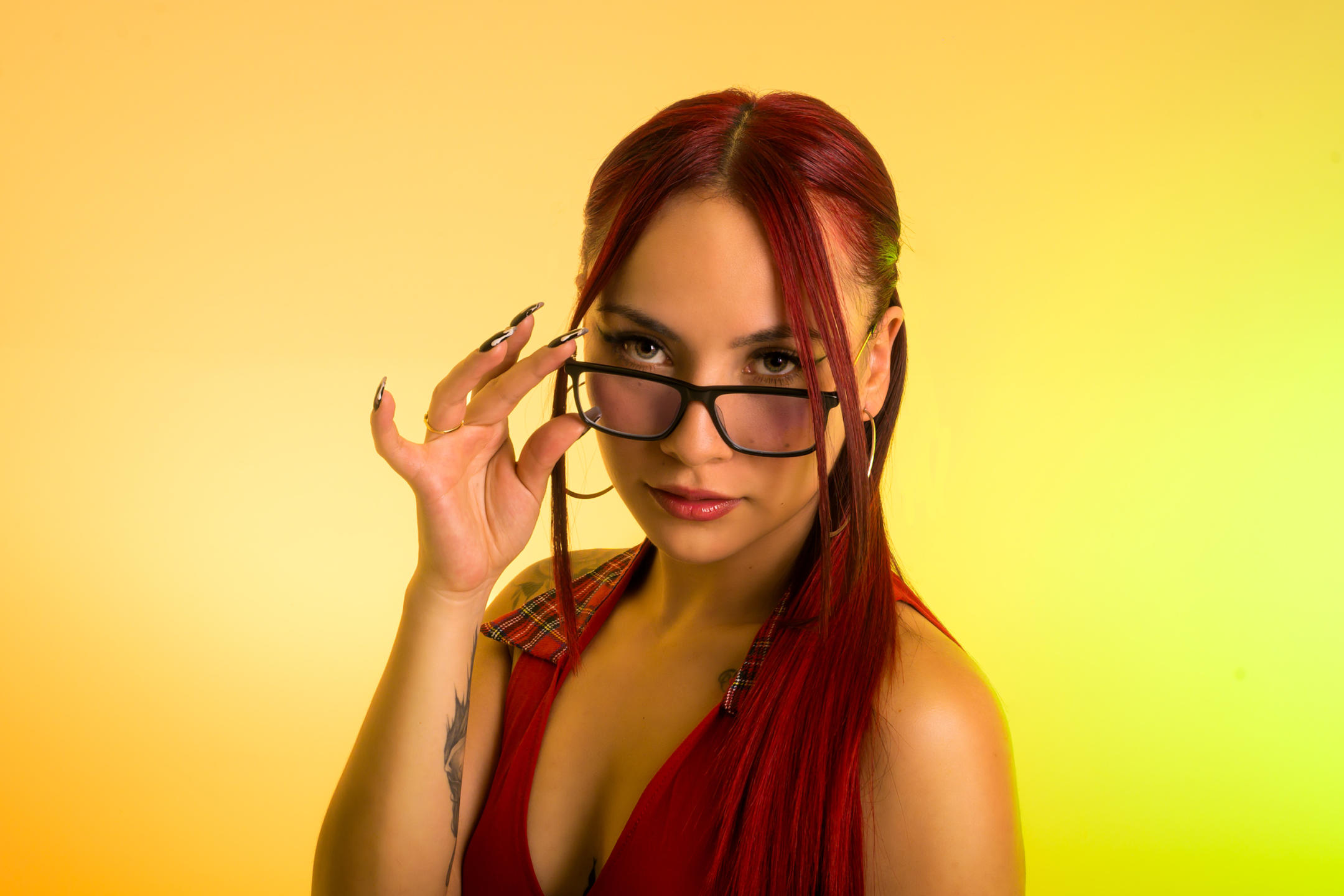 I den brændende refleksion af mit røde hår, sammenflettes ilden af min lidenskab og mit ønske. Ilden af min lidenskab og lyst. Fin og dristig, i hver sving er jeg et digt, min krop, et lærred af skønhed, som livet skriver. Mine røde læber, dør til fristelse, hvisker hemmeligheder, som kun vinden kender. Med et flirtende blik, trodser skæbnen, i hvert blink, overgiver universet sig. Mine tatoveringer, historier indgraveret i huden, vidnesbyrd om en fri og vild sjæl. I mine tynde linjer gemmer der sig styrke, essensen af en kvinde, der udfordrer normen
