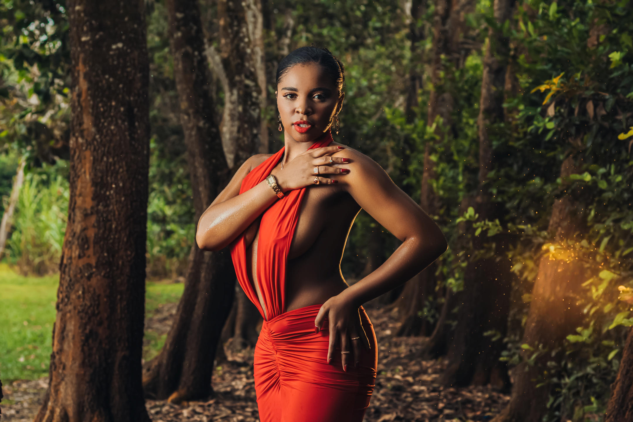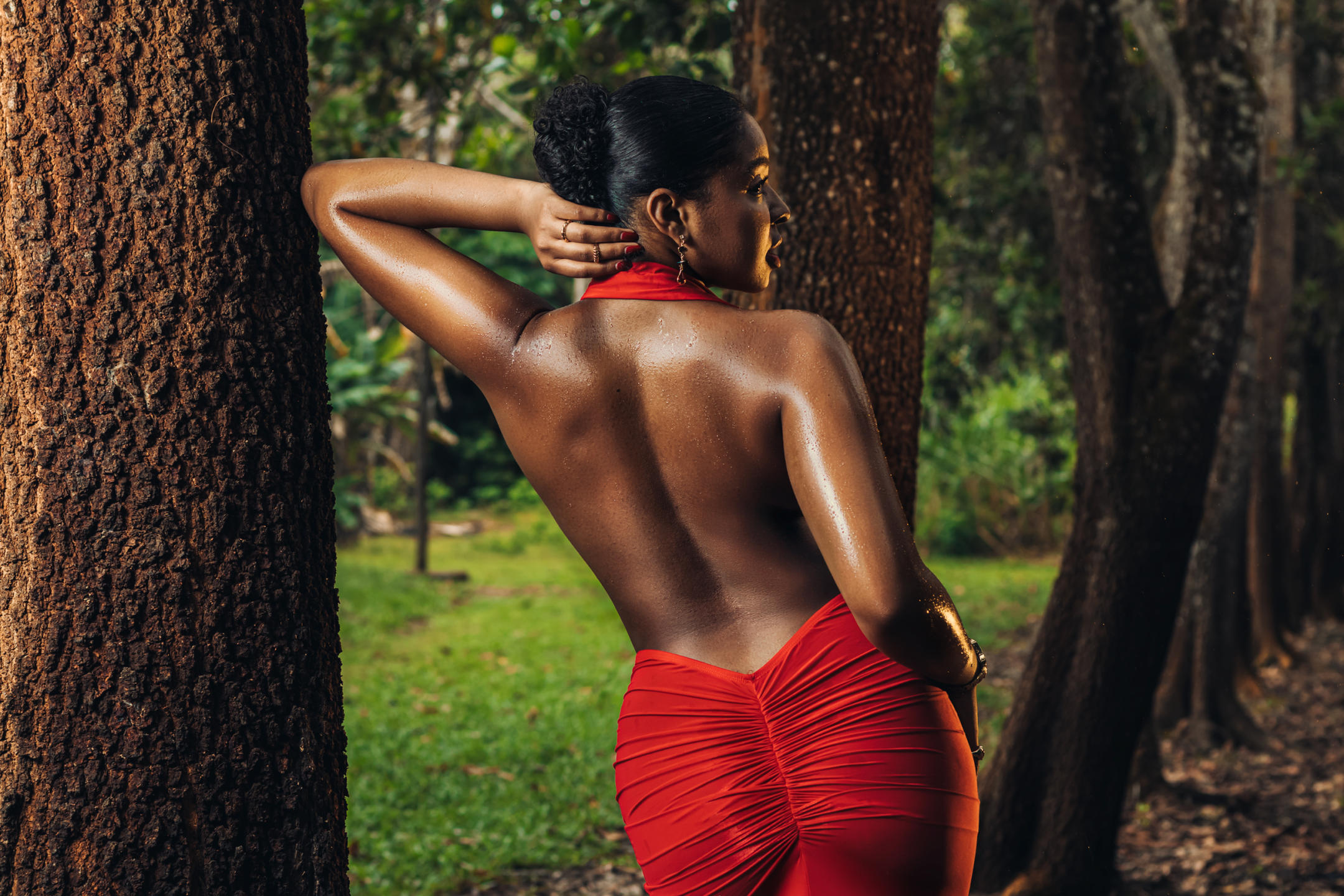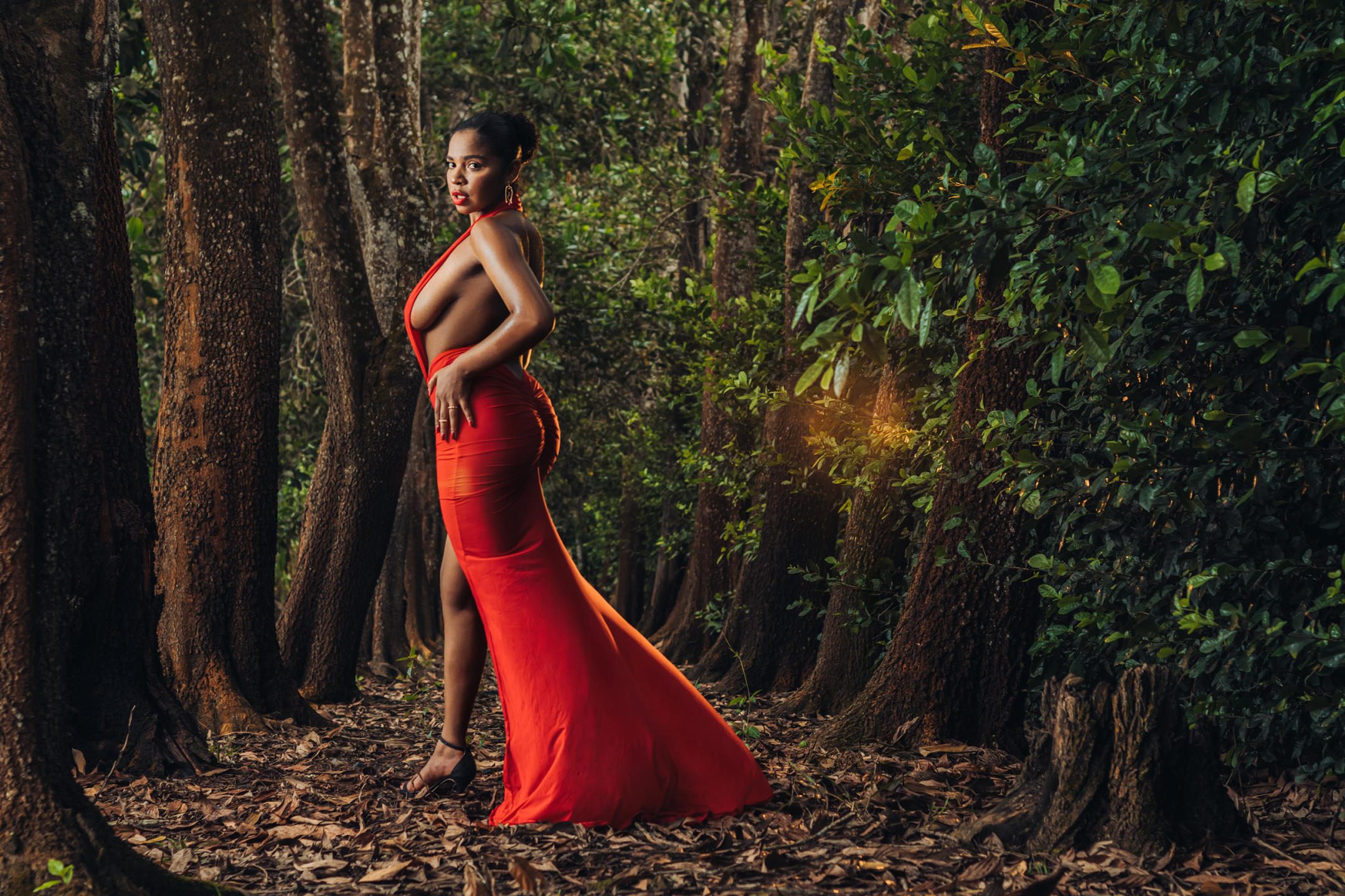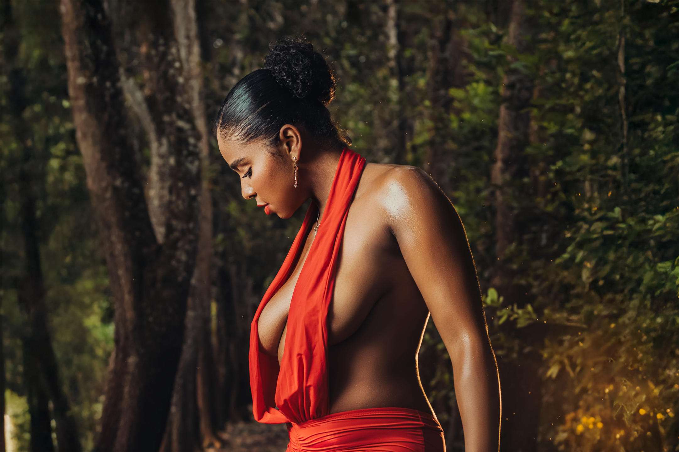 En el rincón más íntimo de la naturaleza, donde el aire es fresco y el susurro del viento acaricia la piel, hay una mujer cuya belleza parece haber sido esculpida por las manos del universo. Cada paso que das en este paraíso de hojas y flores silvestres es una danza de gracia y sensualidad. Una obra maestra de la Madre Tierra, su cuerpo fluye en armonía con el medio ambiente. Las suaves curvas de sus caderas se asemejan a colinas que se elevan en la distancia, mientras que su piel de porcelana brilla con un brillo natural, como la luz del sol filtrándose a través de las ramas. Mientras camina, despierta la vida a su alrededor. Los pájaros cantan sus canciones en su honor y las mariposas bailan a su alrededor como si fueran sus compañeras de juegos. Los árboles extienden sus ramas hacia ella a modo de saludo, reconociendo la armonía entre esta criatura y el mundo natural que la rodea. Ella encarna la esencia de la belleza en su forma más pura y verdadera, un ser humano en armonía con la tierra, un recordatorio de las maravillas de la naturaleza y la magnificencia de la vida en su máxima expresión.