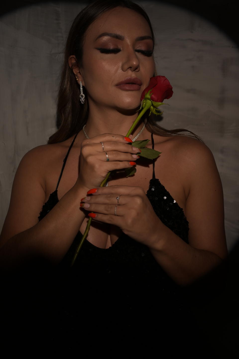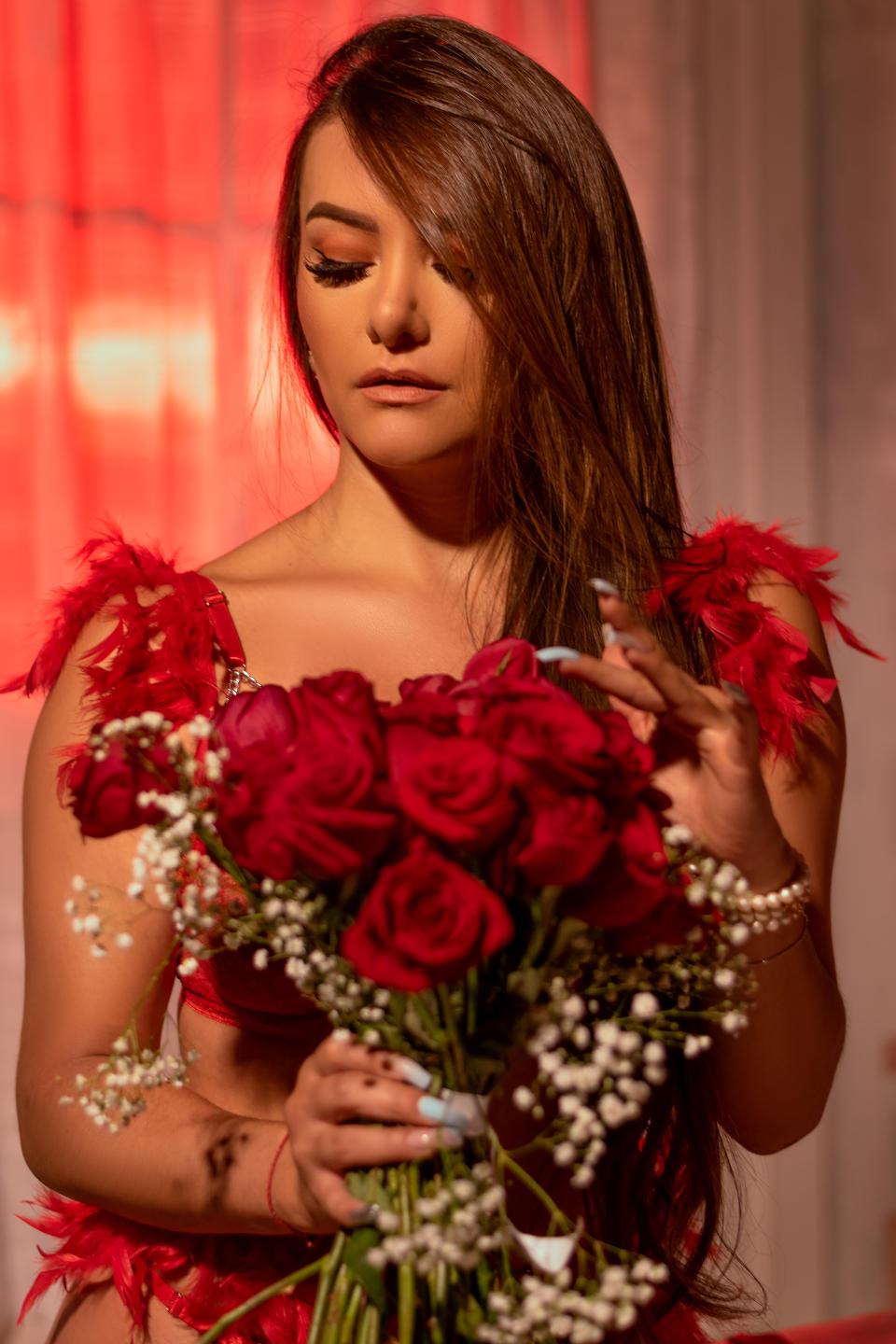 Dans ces photos, je me suis sentie puissante et sophistiquée. Entourée de ballons rouges, avec un verre de vin à la main, c’était comme si j’étais au centre d’une célébration intime et élégante. Le contraste de la robe noire avec les tons vibrants du rouge me donnait l’impression d’être la protagoniste d’un film de luxe.Le verre de vin dans ma main symbolisait le plaisir et la sérénité. Chaque gorgée me permettait de me détendre et de me concentrer sur l’instant. En posant, mon esprit était calme, mais en même temps, j'étais consciente du pouvoir que je projetais à travers ma posture et mon regard.Cette séance n’a pas seulement capturé ma sensualité, mais aussi ma capacité à mélanger force et féminité en une seule image. Ce fut une expérience où la confiance et l’acceptation de soi se sont manifestées naturellement. Tout au long de la séance, je sentais comment l’environnement et mon attitude se fusionnaient parfaitement, créant une atmosphère où le luxe et le désir se rencontraient..