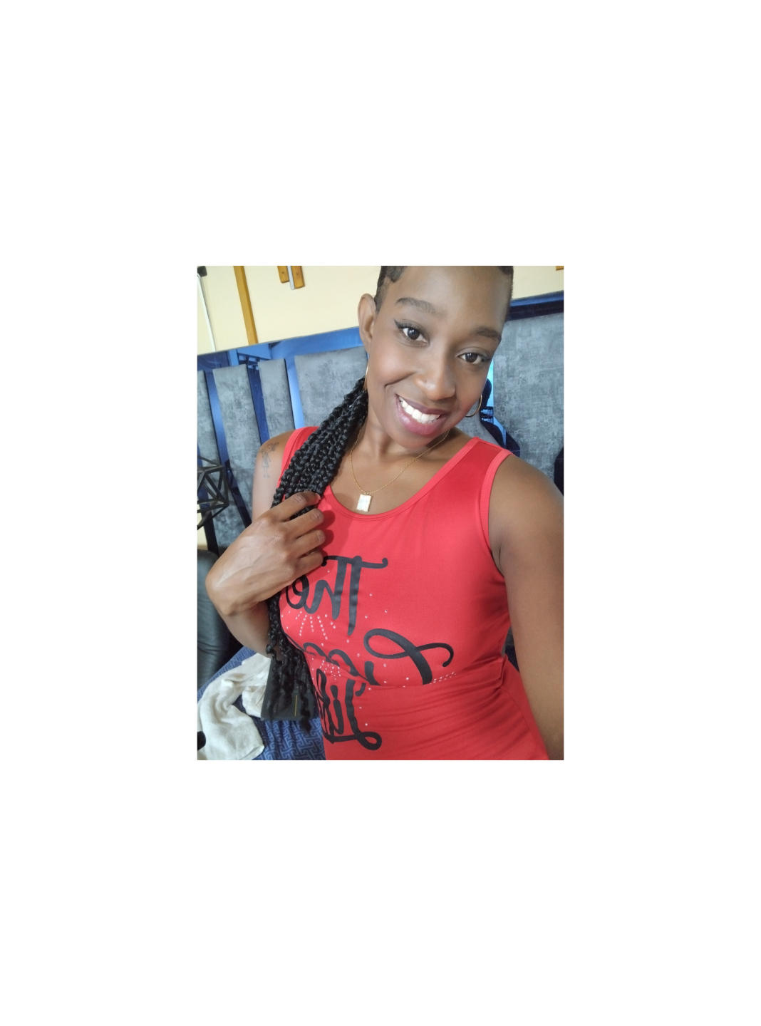 Eu sou uma mulher com pele preta, grandes olhos castanhos, eu sou 1. 58 longos, finos cabelos pretos, lábios grossos, sorriso atraente, sou uma pessoa que não tem uma perna, mas isso não me impede, sou muito extrovertida, carinhosa, adoro música de todos os gêneros, gosto de dançar, cantar