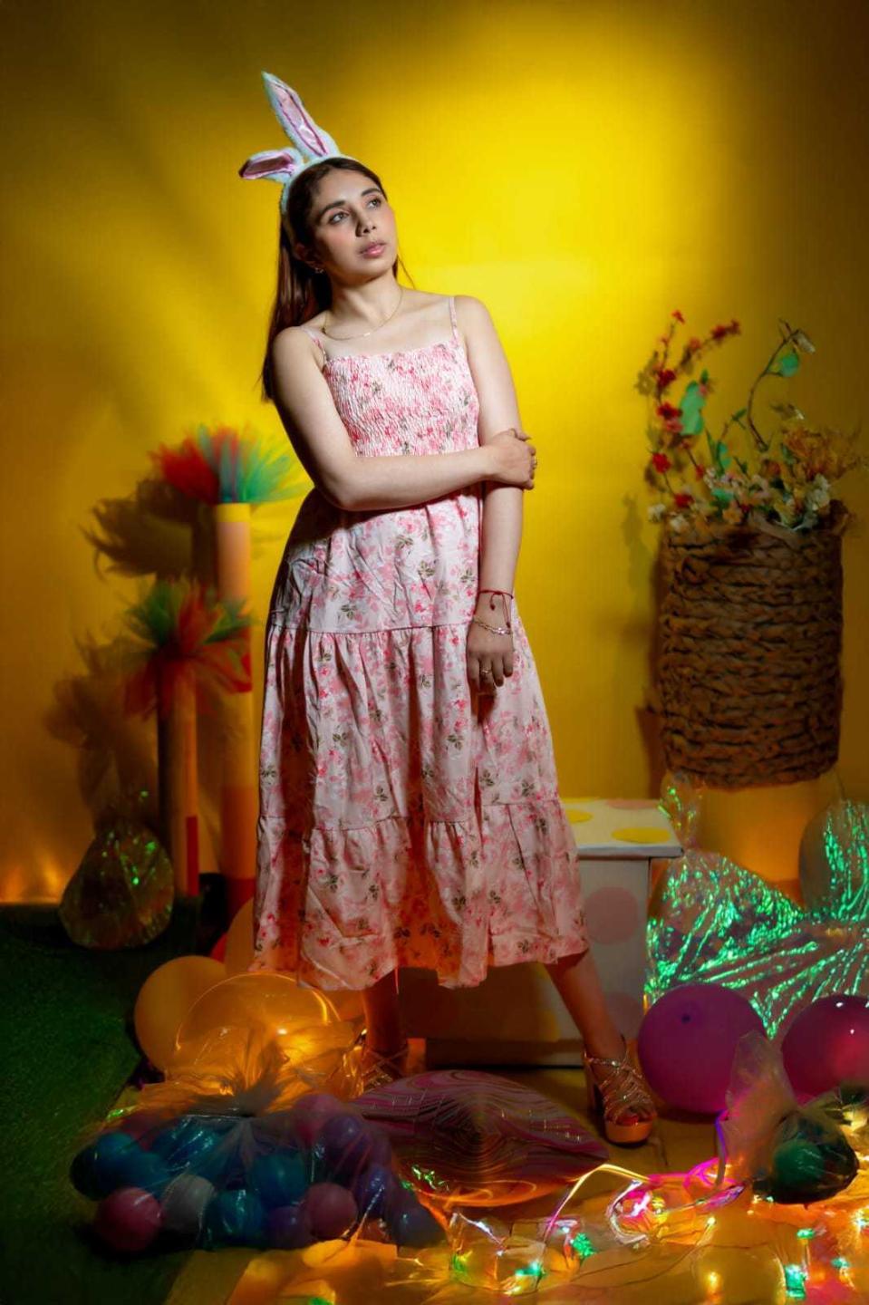 Ochii mei maro, expresivi, oferă o senzație de profunzime și experiență de viață, care echilibrează elementele atrăgătoare ale modei.. Poziția mea, cu fața în jos și picioarele ridicate într-un mod jucăuș, adaugă o energie dinamică și juvenilă scenei, fără a-mi sacrifica echilibrul inerent.. Pantofii mei roșii, cu toc înalt și cu fundițe delicate la glezne, îmi alung silueta, în timp ce accesoriile mele argintii (un colier strălucitor și un ceas clasic) indică o atenție profesională la detalii.. Fiecare element, de la iarbă fină din pampa din fundal până la machiajul impecabil care reflectă tonul rochiei mele, lucrează împreună pentru a mă reprezenta, deoarece sunt o femeie care se simte complet confortabilă cu sine..