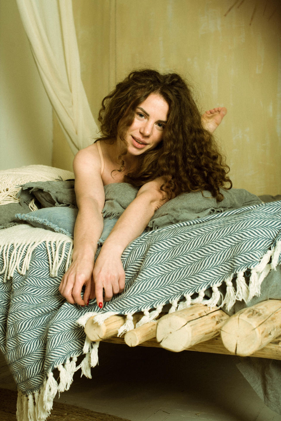 Мои кудри падают дикими, неукротимыми волнами, обрамляя мое лицо непринужденной красотой. Каждая прядь ловит свет, открывая золотые блики, которые переливаются, как огонь. Мои глубокие, выразительные глаза хранят в себе мир тайн, приглашая вас присмотреться, заблудиться в их глубинах. В моей улыбке есть что-то игривое, что-то затянувшееся, дразнящее, как будто я знаю секрет, которым могу поделиться только я.