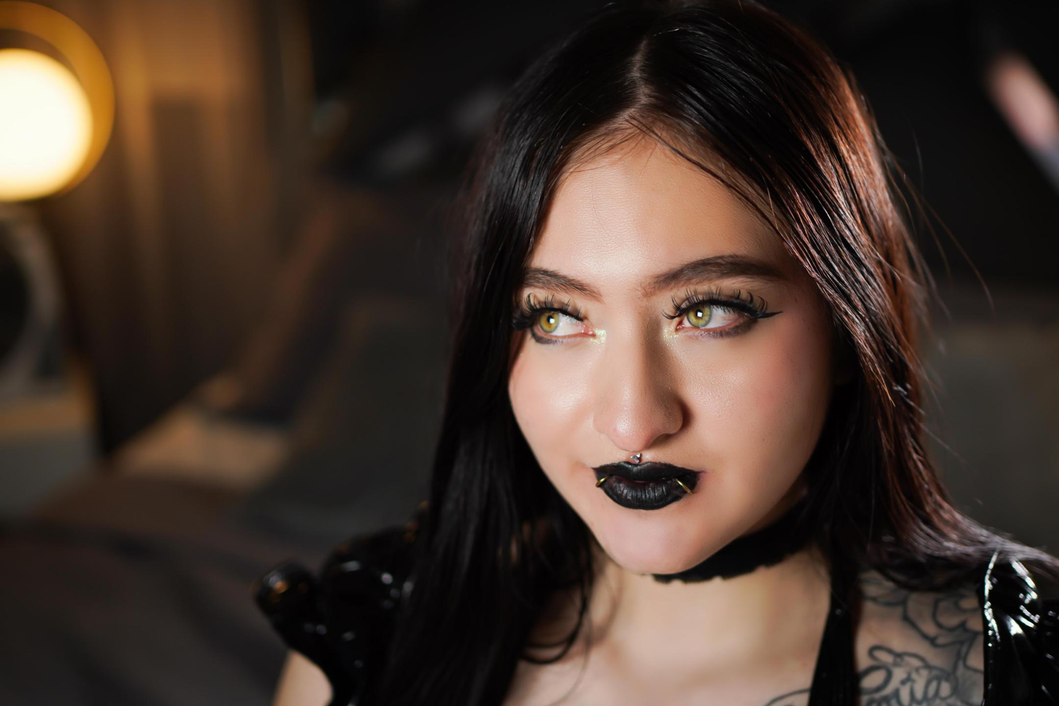 She is a young woman, with a dark and magnetic aura, with pale skin that contrasts with her azabache black hair and intense lips painted deep red. Her gaze is penetrating, covered by a marked outline that makes her look like a living mystery. She always dresses with gothic touches: tight corsets, black lace, necklaces with inverted crosses or velvet chokers that highlight the whiteness of her neck. She walks with a mixture of elegance and provocation, as if she knew that every step she takes awakens hidden desires. She has a high level of sexual desire that is reflected in her body language: she plays with her lips, keeps long and intentional glances, subtly touches whoever interests her, enjoying the tension it causes. Its erotic energy is constant, almost wild, and it feeds on the mystery and the forbidden. She likes to dominate the atmosphere with her dark sensuality, making everything around her feel intense, risky and exciting.