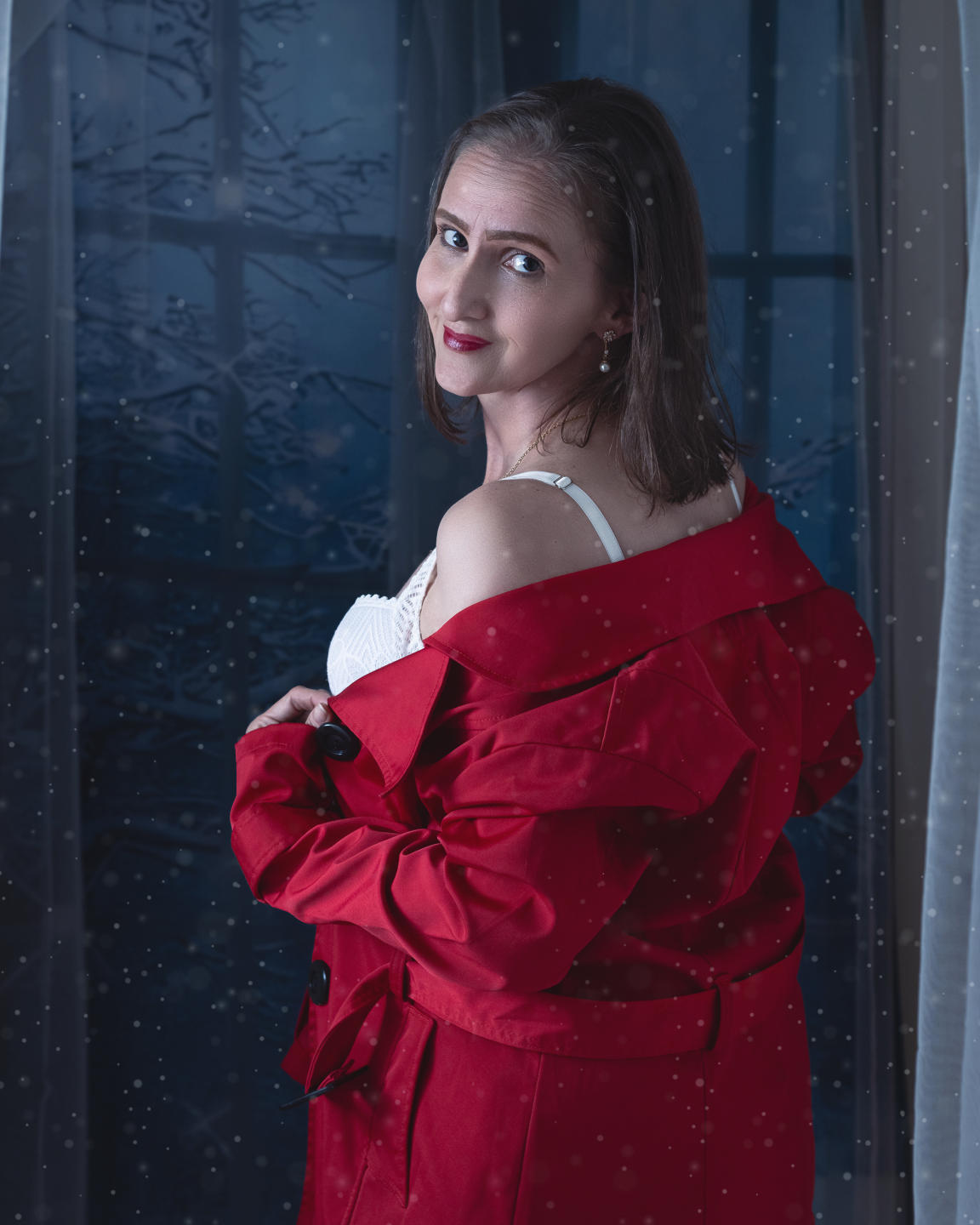 Sitter vid trädet, i den där öppna röda klänningen, långa handskar, röda strumpor och glänsande hud. Santa Claus är inkarnationen av "Santa baby, skynda ner min skorsten ikväll". Den här bilden skriker december-tema sessioner: gåvor, strumpor fulla av överraskningar, och tips som faller som varm snö. Jag älskar hur du kramar den där kudden som om det är en hemlighet som bara du och jag känner till.