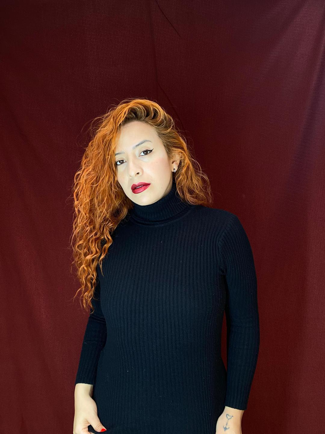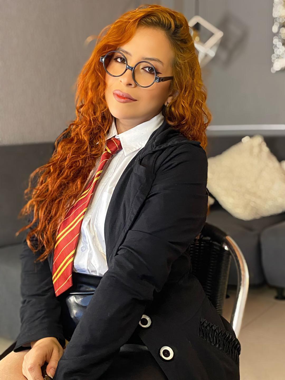 A redhead with an intense gaze, her hair burning like fire in the light. Her fair skin contrasts with provocative lips and an attitude that blends sweetness with danger.