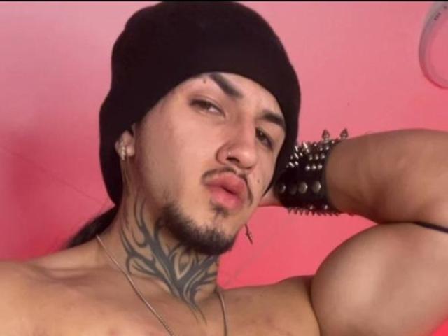 He has an athletic, well-defined physique, with muscular arms and a toned torso. He has visible tattoos on his neck (a tribal design that extends down to his chest), on his arm, and on his lower abdomen. He wears a black cap, earrings—one hoop and one pendant—a nose piercing, and a nipple piercing. He also wears a chain with a cross-shaped pendant. His expression is serious and confident, with an intense gaze and defined lips, projecting a strong and dominant image..